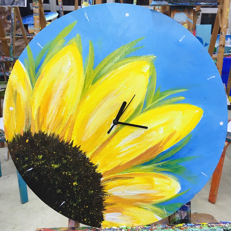 – All art materials included, i.e. a 30x30cm square canvas***, a clock kit, battery, free flow of quality acrylic paints, brushes, palette, apron, idea books and a soft drink
