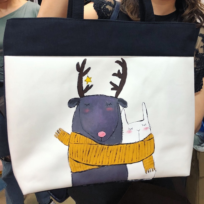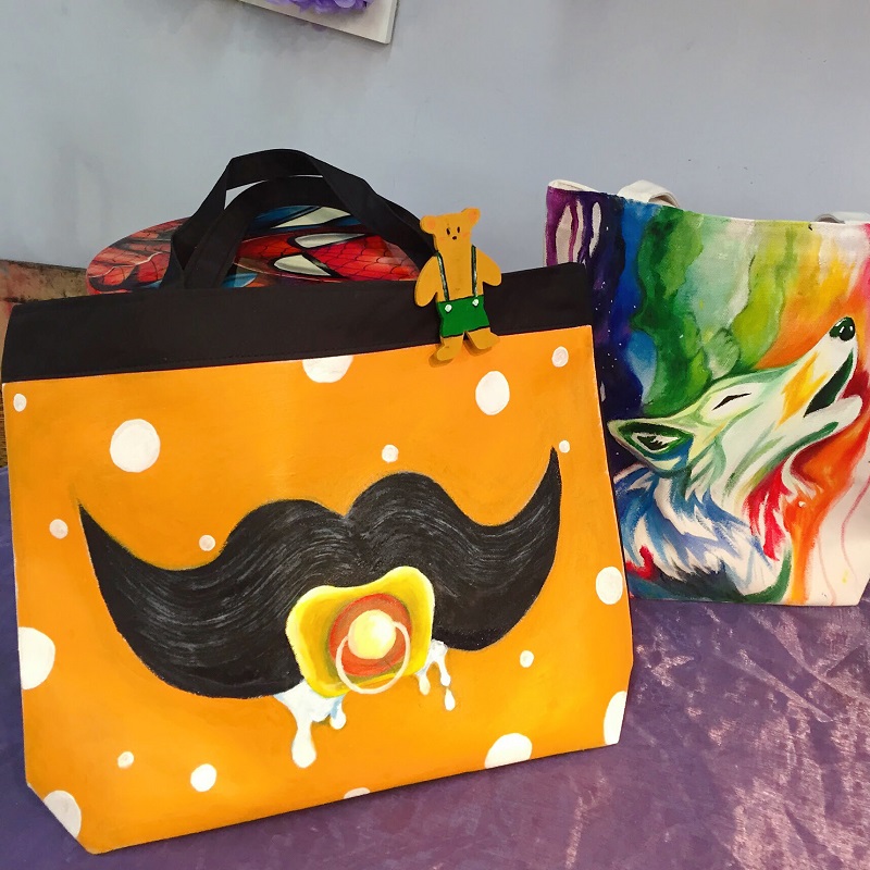 – All art materials included, i.e. a canvas tote bag with zipper (size: 42Wx34H cm, handle 22cm), a free flow of quality acrylic paints, brushes, palette, apron, idea books and a soft drink
