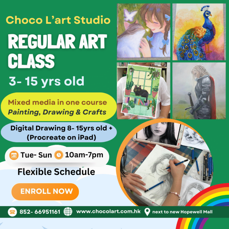 Right next to the new Hopewell Mall at Wan Chai, Choco L’art Studio sets up for all ages offering relaxing and pleasurable experience of art jamming and painting in Hong Kong. Featuring a 270-degree window’s view, bright sunlight floods the studio in the afternoons, making it feel especially warm and cozy.